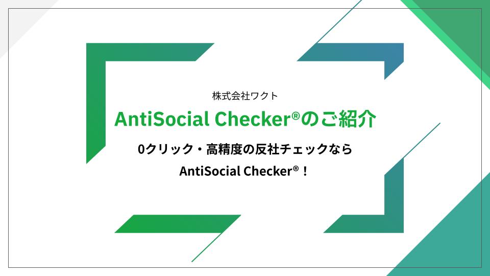 AntiSocial Checker®の反社チェックについて、サービス概要や調査方法、強み、機能、などをまとめた資料となっております。